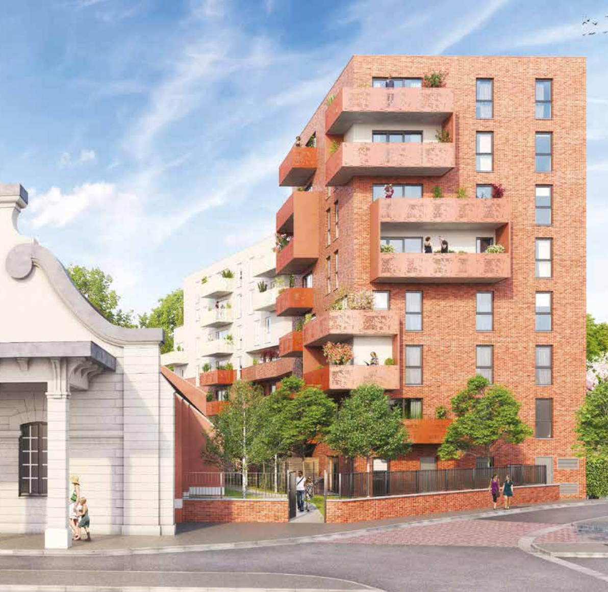 paysagé en relation avec le manège. Les façades donnant sur l’intérieur de l’îlot sont recouvertes d’un enduit gratté ton brique rouge pour les premiers niveaux, puis ton calcaire blanc dans les étages supérieurs. Les garde-corps des balcons et loggias sont réalisés en serrureries et tôles laquées perforées de même teintes que les façades.